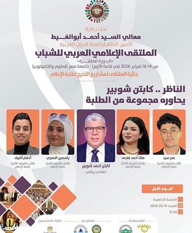 تنطلق فعاليات الملتقى الإعلامي العربي للشباب في دورته العاشره الذي ينظمه الملتقى الإعلامي العربي بالتعاون مع جامعة مصر للعلوم والتكنولوجيا ، وبرعاية كريمة من أحمد أبوالغيط الأمين العام لجامعة الدول العربية ، وذلك خلال الفترة ما بين 14 حتى 16 فبراير 2026.