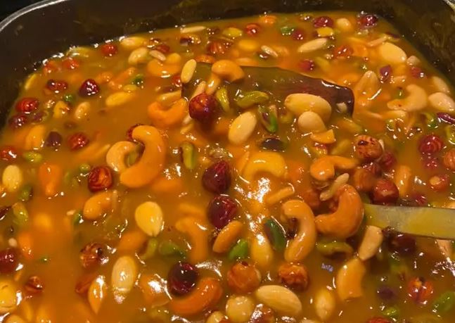 وتتكون هذه الأكلة التاريخية من قمر الدين والمكسرات والتين، والمشمش المجفف، واللوز، والفستق، والصنوبر، والزبيب، والتمر المجفف، والهيل، وتُطبخ بالسمن البلدي.