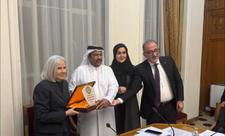 السفيرة الدكتورة هيفاء أبو غزالة الأمين العام المساعد رئيس قطاع الشؤون الاجتماعية تكرم المستشار جابر المري رئيس لجنة الميثاق بمناسبة انتهاء ولايته.