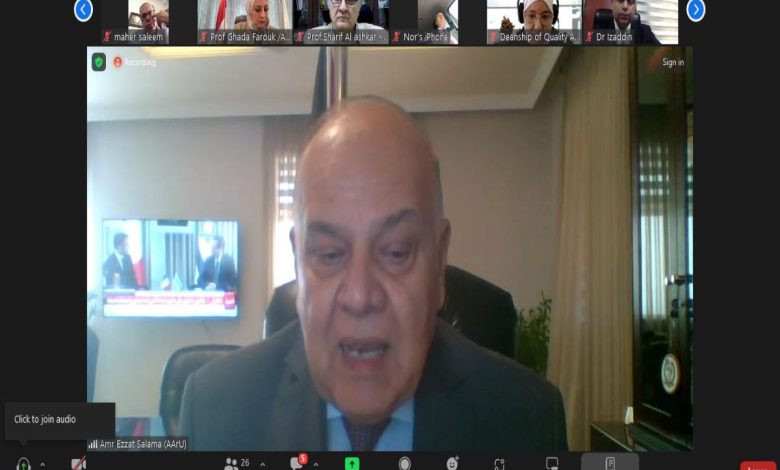 وفي كلمة راعي الافتتاح، معالي الأمين العام لاتحاد الجامعات العربية أ. د. عمرو سلامة، قال: “في الوقت الذي نفتتح به منصة مجلس المسؤولية المجتمعية، هنالك جرائم حرب وعدوان غاشم ترتكب بحق المدنيين على المستشفيات والجامعات ودور العبادة في القطاع”، معلناً: “إننا في الاتحاد العام للجامعات العربية، نستنكر كل ما ترتكبه إسرائيل، وندعو لوقف سفك دماء المدنيين الأبرياء، ونناشد التدخل السريع من أجل حماية الآمنين وضمان حق الطلبة في التعليم”.