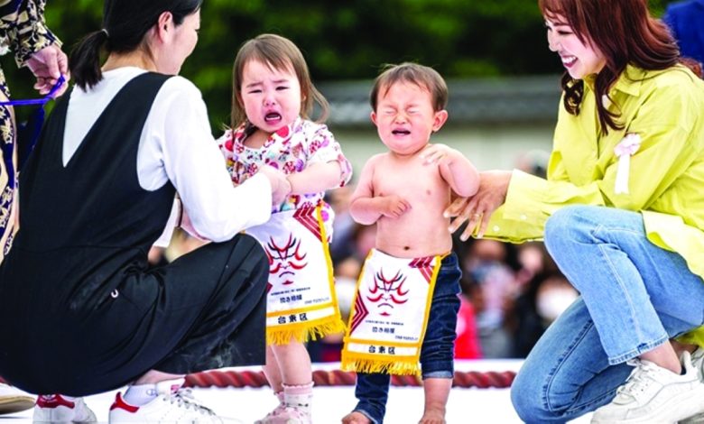 بعد توقف لأربع سنوات بسبب الجائحة، عاد مهرجان «سومو بكاء الأطفال»، الذي يتواجه فيه عشرات الأطفال اليابانيين وهم يبكون، فيما يعتقد أنه يحسن من صحتهم. ويتنافس في هذا المهرجان طفلان في كل جولة بزي رياضة السومو، فيما يرفعهما والداهما، ليتواجها على حلبة لهذه الرياضة في معبد سينسوجي الواقع في العاصمة طوكيو.